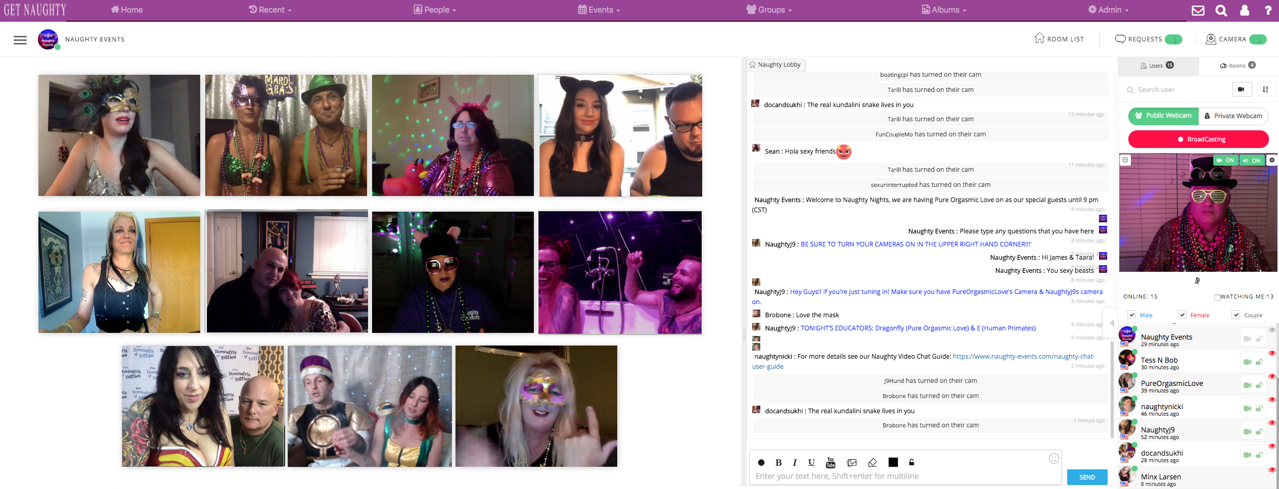 By getting a Naughty Membership, you can see who is actually going to our events and who isn't. Many lifestyle websites allow some of their members to post that they are going, but it is impossible to see who is going on these different websites, you can only see the actual attendees by joining here. For only $10 a month, you can see who's going, check out their profiles, which will tell you where they are from, what they are into and you can see their pictures, but you can also go onto our new chatrooms and video chat with other Naughty Members. It allows you to purchase passes to our Naughty Nights hosted parties and attend free Happy Hour events and Meet & Greets.