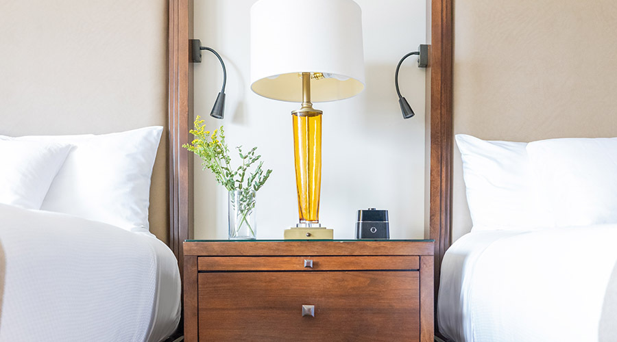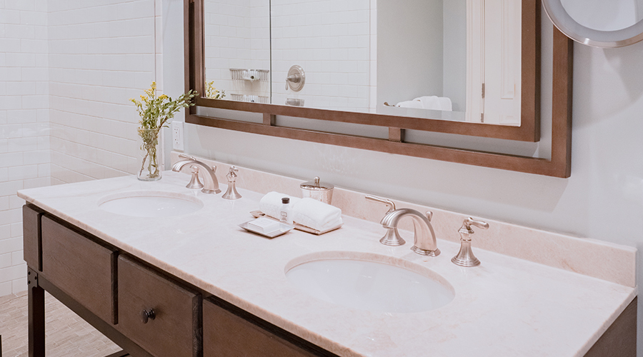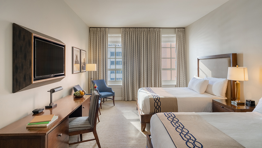 The 28 Deluxe Double Queen guestrooms offer up to 535 square feet of living space and accommodate up to 4 guests. Rooms have desks and reading chairs, while bathrooms have large subway-tiled showers and sleek vanities with enhanced makeup mirrors.