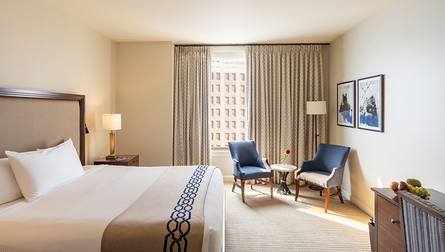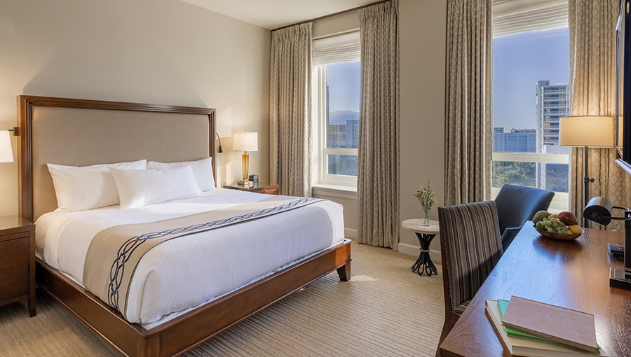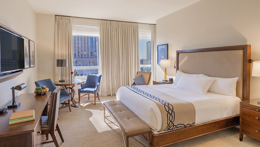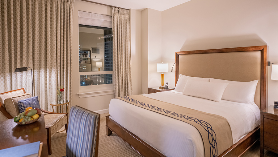 The spacious Deluxe King rooms boast up to 498 square feet of luxurious accommodations. Rooms feature long entrance hallways, oversized windows, desks, and reading chairs, while bathrooms have large subway-tiled showers and sleek vanities with enhanced makeup mirrors.