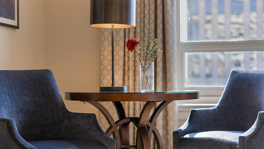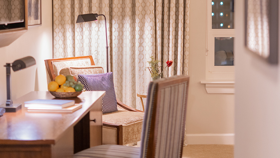 The Corner Deluxe Suite King is the largest of NOPSI's Suites at over 800 square feet. It is airy and bright, featuring a separate living area, multiple windows, sumptuous furnishings, a desk, a table for two to enjoy room service, and an oversized, spa-like bathroom with a soaking tub.