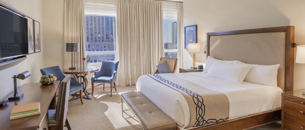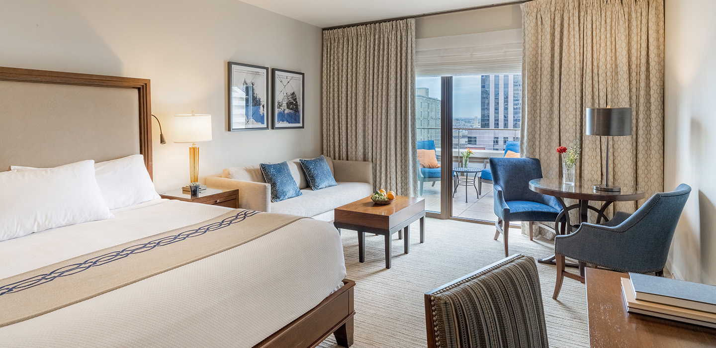 An oasis on the ninth-floor penthouse level, this spacious Deluxe King room features contemporary furnishings and a sweeping terrace offering views of the Superdome and the downtown skyline. A comfortable sofa, a dining table with two chairs, and outdoor seating mean plenty of room to stretch out. The ninth floor is also home to the hotel's rooftop pool and bar, Above the Grid.