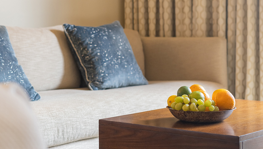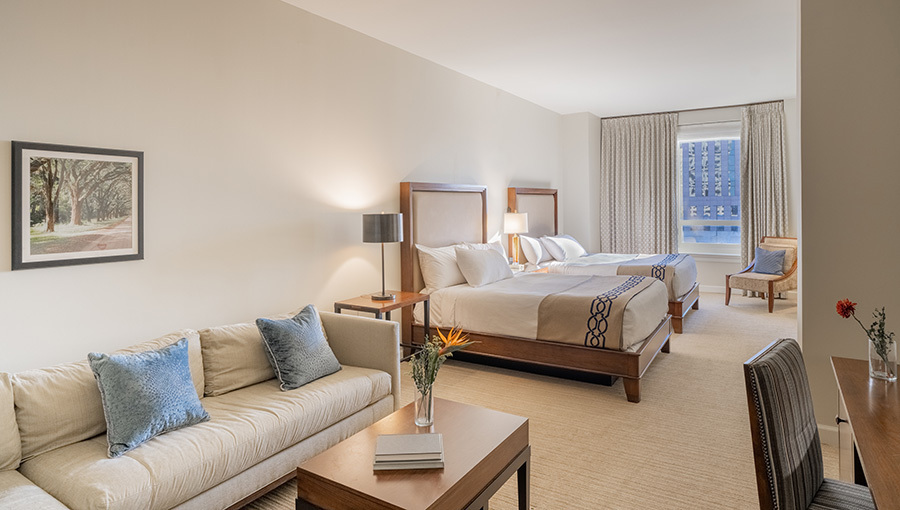 Deluxe Double Queen Suites offer 642 square feet of airy, bright living space, featuring a separate living area, multiple windows, and sumptuous furnishings.