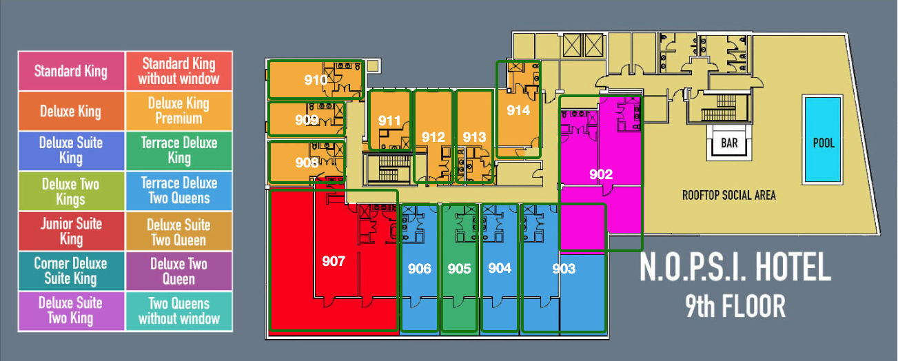 The Secoond Floor is home to the Playroom and the Gym. Floors Three through Eight are identical, and the Ninth Floor is the Penthouse Level, where the Rooftop Pool and Bar is located, and the only rooms with Terraces. You can now coordinate with your friends to be on the same floor and have more control over where you will be in the hotel (depending on availability when you book your rooms).