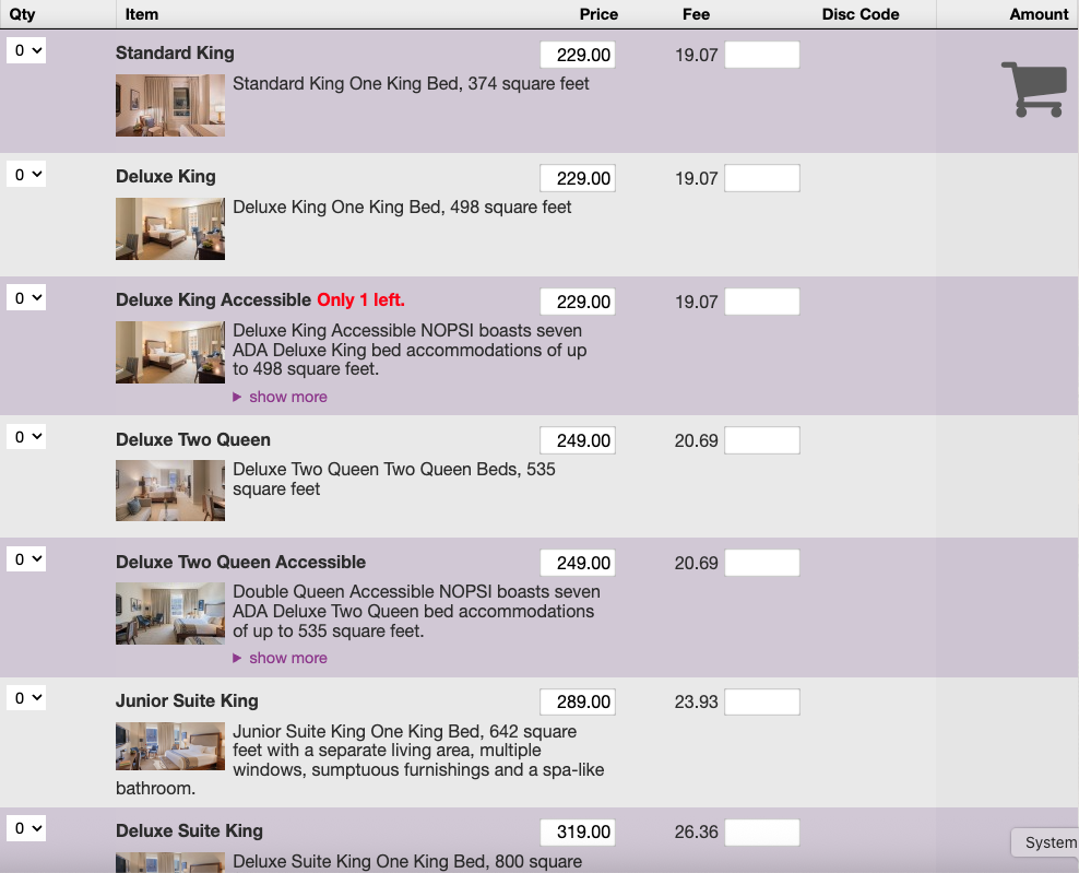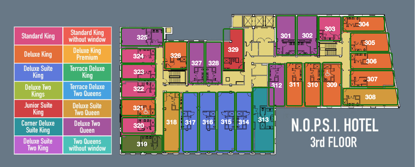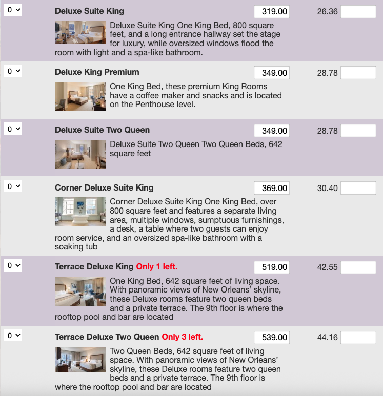 There are several different room types to choose from. Here is a list of room types and their corresponding nightly prices. Note that you can see on any website that room prices in New Orleans at the end of October are high. We got a great deal and are passing the savings on to you. You won't find any hotels as lovely as the NOPSI Hotel at these prices anywhere near. So, book soon if you want to be in the main hotel, where all the parties will be held.
