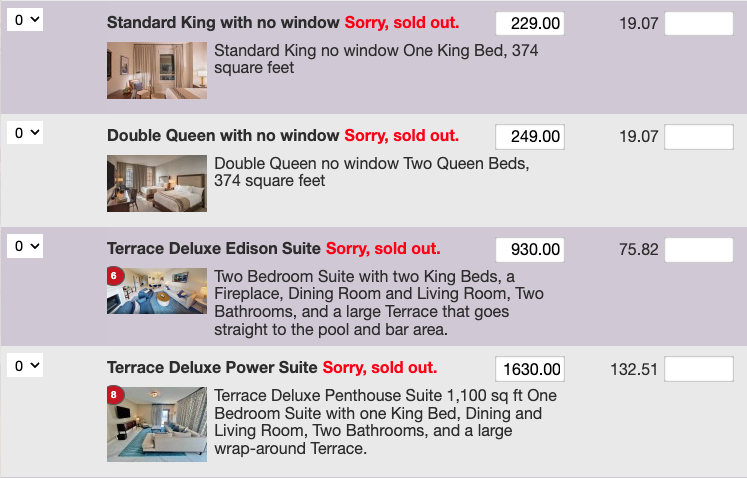 Our two Penthouse Suites and all Handicap Accessible rooms are available by request. We do not put these up for sale, so even though these rooms might show as sold out, we may have some available. Please email us at Info@Naughty-Events.com for more information on these options.